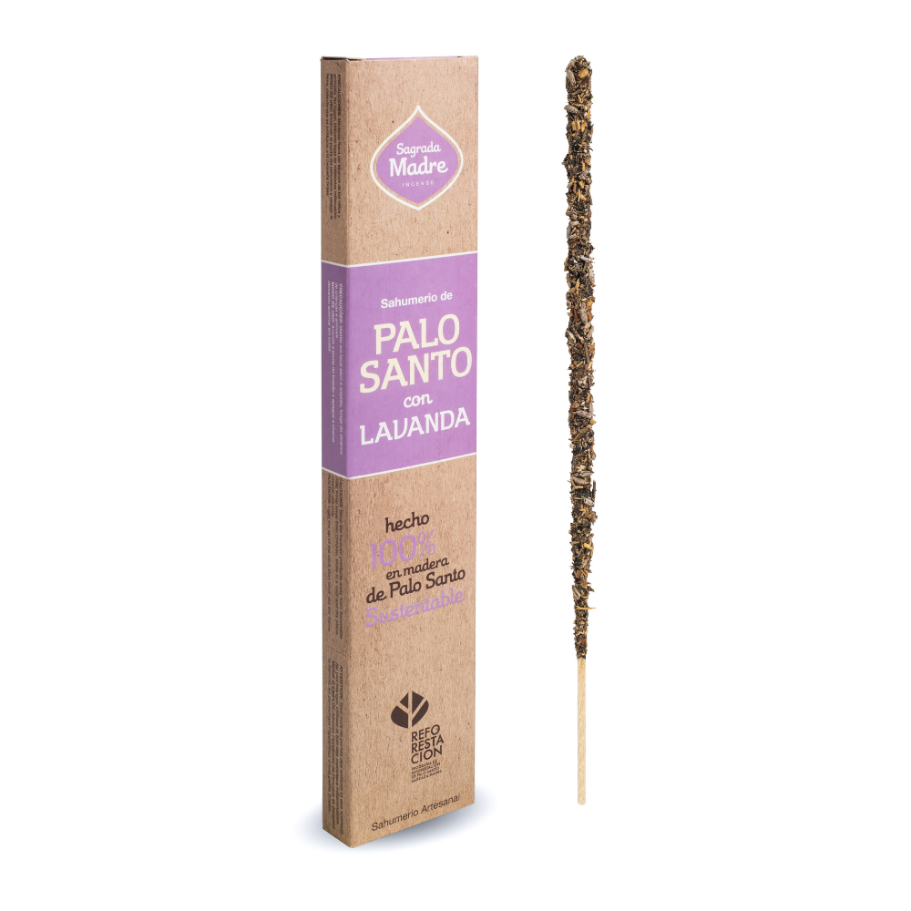 Composición: Hecho a mano con madera de Palo Santo (Perú), flores de lavanda, aceite esencial de lavanda, aglutinante natural y sal.